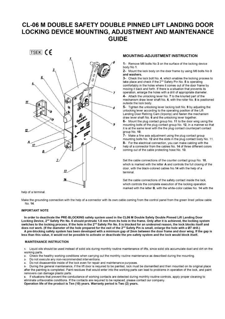 قفل ایمنی مضاعف مدل CL-06 از سری تجهیزات پیشرفته شرکت CAN-LIFT است که با هدف افزایش ضریب ایمنی در سیستم دربهای آسانسور طراحی شده است. این محصول با بهرهگیری از مکانیزم دوپین ایمنی و سیستم کنترل الکتریکی، امکان قفلسازی مطمئن و جلوگیری از باز شدن ناخواسته درب را فراهم میسازد. راهنمای حاضر شامل دستورالعملهای کامل نصب، تنظیم و نگهداری این قفل است تا تکنسینها و مهندسان بتوانند با رعایت نکات فنی، عملکرد دقیق، عمر مفید بالا و ایمنی کامل را در شرایط عملیاتی مختلف تضمین کنند. رعایت اصول ذکرشده در این سند، ضامن بهرهبرداری ایمن و بدون اختلال از سیستم قفل درب آسانسور خواهد بود.