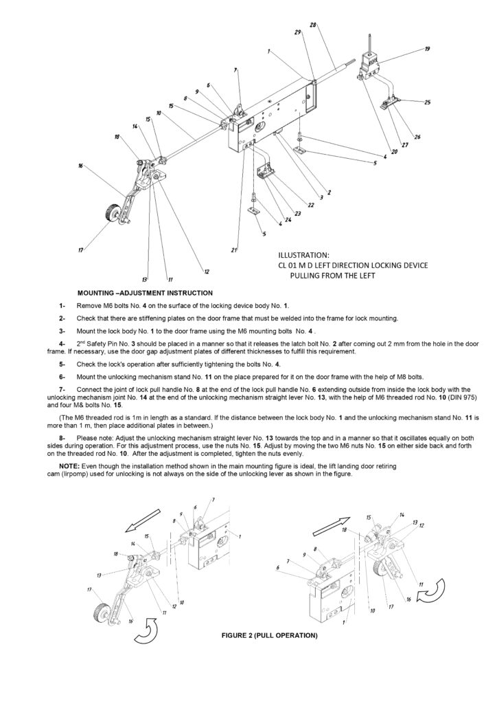 - پیچ شماره (9) را وارد سوراخ شماره (2) در درب کرده و مطمئن شوید که پیچ از این سوراخ عبور کرده و با کمک سوراخ شماره (3) وارد بدنه قفل شود. صفحه تقویتی شماره (8) را تنظیم کرده و پیچ شماره (9) را محکم کنید. سپس بدنه قفل را با پیچهای M6 (مطابق استاندارد DIN 975) تثبیت کرده و عملکرد قفل را بررسی نمایید.