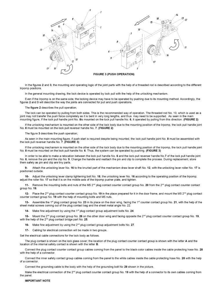 برای غیرفعالسازی سیستم ایمنی پیش از قفل شدن، پین ایمنی شماره (5) باید حداقل ۱.۵ میلیمتر از سوراخ قاب درب بیرون زده باشد. تنها در این حالت، قفل بهدرستی عمل خواهد کرد.